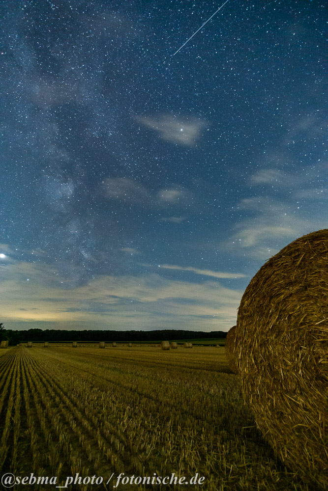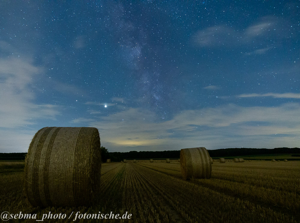 Zu sehen sind gerollte und gepresste Strohballen auf einem Feld, darüber der Sternenhimmel mit der Milchstraße. An diesem späten Abend im August gegen 23:30 Uhr war der Himmel doch recht bewölkt und es wehte ein zügiger Wind. Ich stellte den Fernauslöser ein und schoss diverse Bilder, immer in der Hoffnung, dass sich eine Wolkenlücke ergeben würde. Bei den beiden gezeigten Bilder hat es (halbwegs) geklappt. Es sind zwar noch Wolken zu sehen, doch die geben dem Bild einen helleren Look.