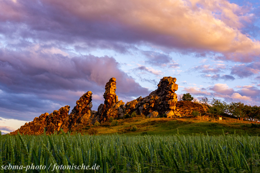 Jeden Abend schaute ich mir den Wetterbericht an und sah ständig zum Fenster heraus. Leider war Anfang Juni 2020 nicht so wirklich tolles Wetter – meist war es bewölkt oder regnerisch, nur wenige Tage sonnig. Am Abend des 6. Juni war es zwar wiedermal bewölkt, doch es waren auch einige Wolkenlücken vorhanden. Also schnappte ich mir die Kamera und fuhr zur Teufelsmauer bei Weddersleben. Ich suchte mir eine gute Stelle, um die Mauer von unten zu fotografieren. Das orangene Licht beleuchtete die Mauer sehr schön und hob ihre Struktur hervor. Gleichzeitig wurden die Wolken lila und das Feld im Vorgrund lieferte einen angenehm grünen Kontrast. Ich konnte nur wenige Bilder schießen, dann schloss sich die Wolkendecke wieder und der Moment der Lichtstimmung vor vorbei.